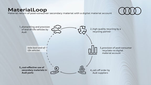 Cerrar los bucles de material en la industria generalmente requiere que varias empresas trabajen juntas. Esto tiene ventajas para todos los involucrados: el socio de reciclaje se beneficia de un flujo predecible de vehículos al final de su vida útil y compradores potenciales del material secundario. Los proveedores potenciales obtienen acceso a reciclados de alta calidad adecuados para la industria automotriz en condiciones estables, y pueden pasarlos a Audi. A su vez, Audi puede estabilizar sus cadenas de suministro de materias primas en mejores condiciones económicas.
